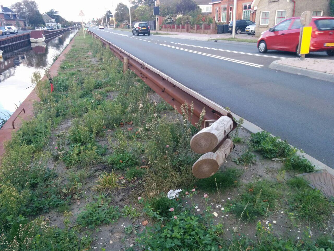 Elk METALEN paaltje waar de vangrail mee in de grond staat, zit ingeklemt door 2 stukken hout. Ook hier weer – hoe is dit duurzaam of co2 neutraal te noemen?