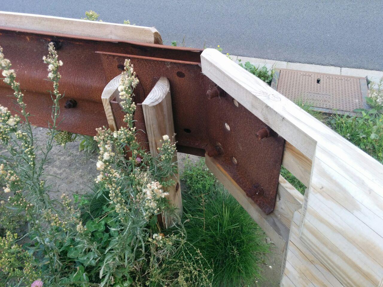 De extra segmenten hout, bevestigd op slechts enkele punten kunnen mijns inziens loskomen bij een flinke impact van een voertuig en de vangrail, die de extra houten laag van de vangrail afschraapt en zo het voertuig en/of bestuurder/passagiers ernstig beschadigd.