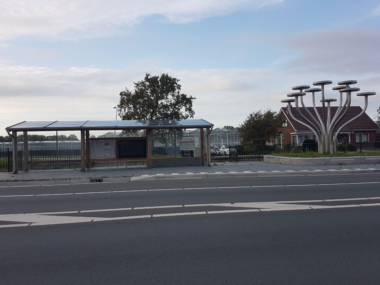 De bushalte ziet er mooi uit van een afstandje. Dichterbij koment valt op dat het grote ‘infoscherm’ uit staat – of kapot is.