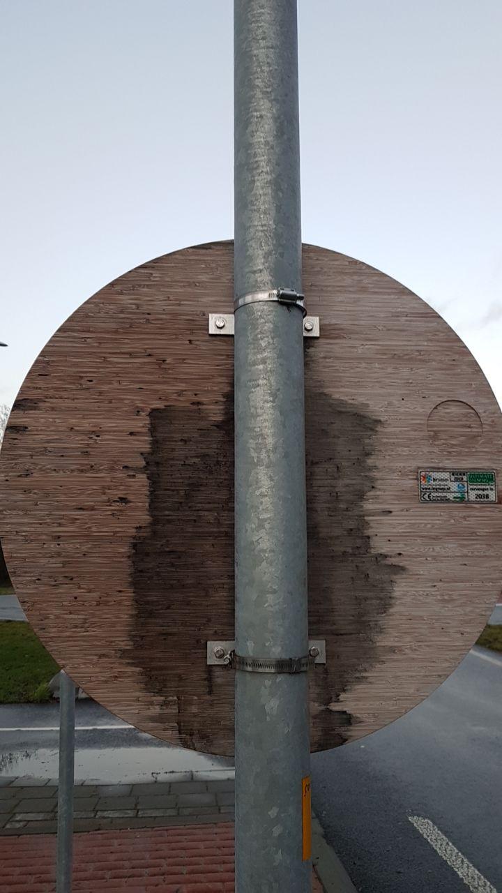 Opvallend is de verschil van kleuren van de borden, waar een enkel bord nieuw lijkt, zijn op de meeste borden de schimmelplekken duidelijk te zien.